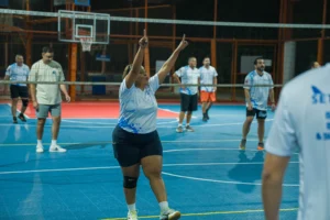 Laughter echoes through the gym as the team moves quickly across the court, diving, jumping, and celebrating each play. Despite it was a night match,